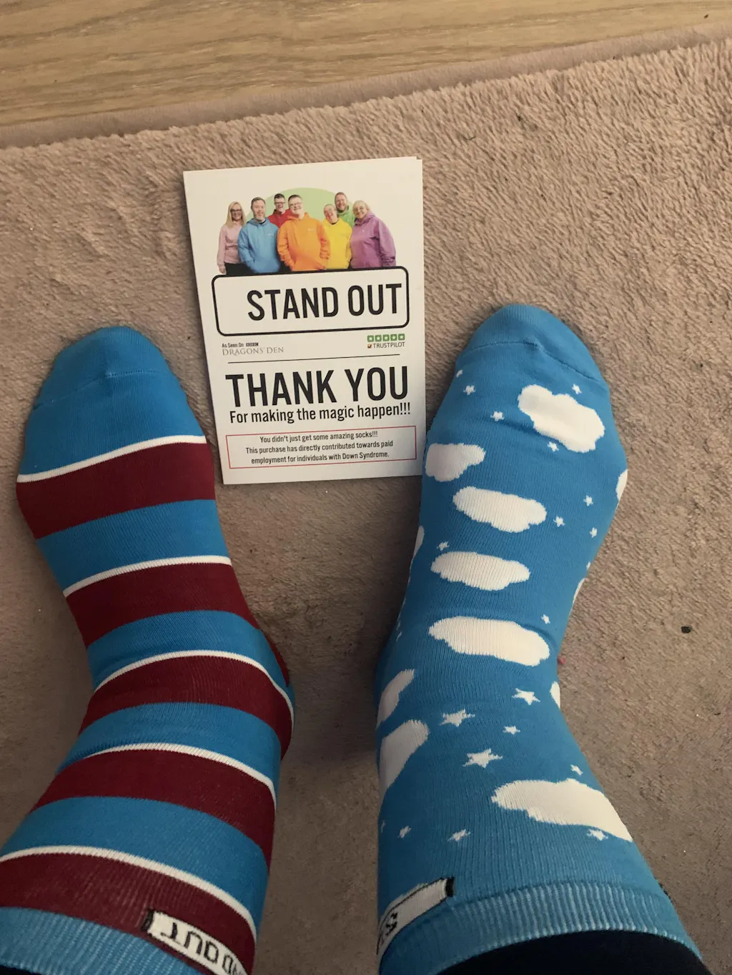 My order came and I was blown away with the presentation and packaging. The quality of the socks was outstanding. I was thrilled! I was able to wear them for World Down Syndrome Awareness Day to celebrate my beautiful little granddaughter who has Down Syndrome. Highly recommend the efficiency of this company and the quality of the socks.